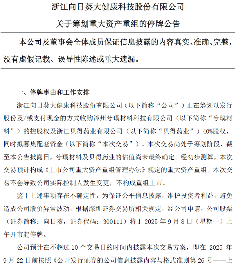 9月7日晚间,浙江向日葵大健康科技股份有限公司(300111)发布重磅公告,宣布公司正在筹划以发行股份及/或支付现金方式收购漳州兮璞材料科技有限公司控股权及浙江贝得药业有限公司40%股权,同时募集配套资金。