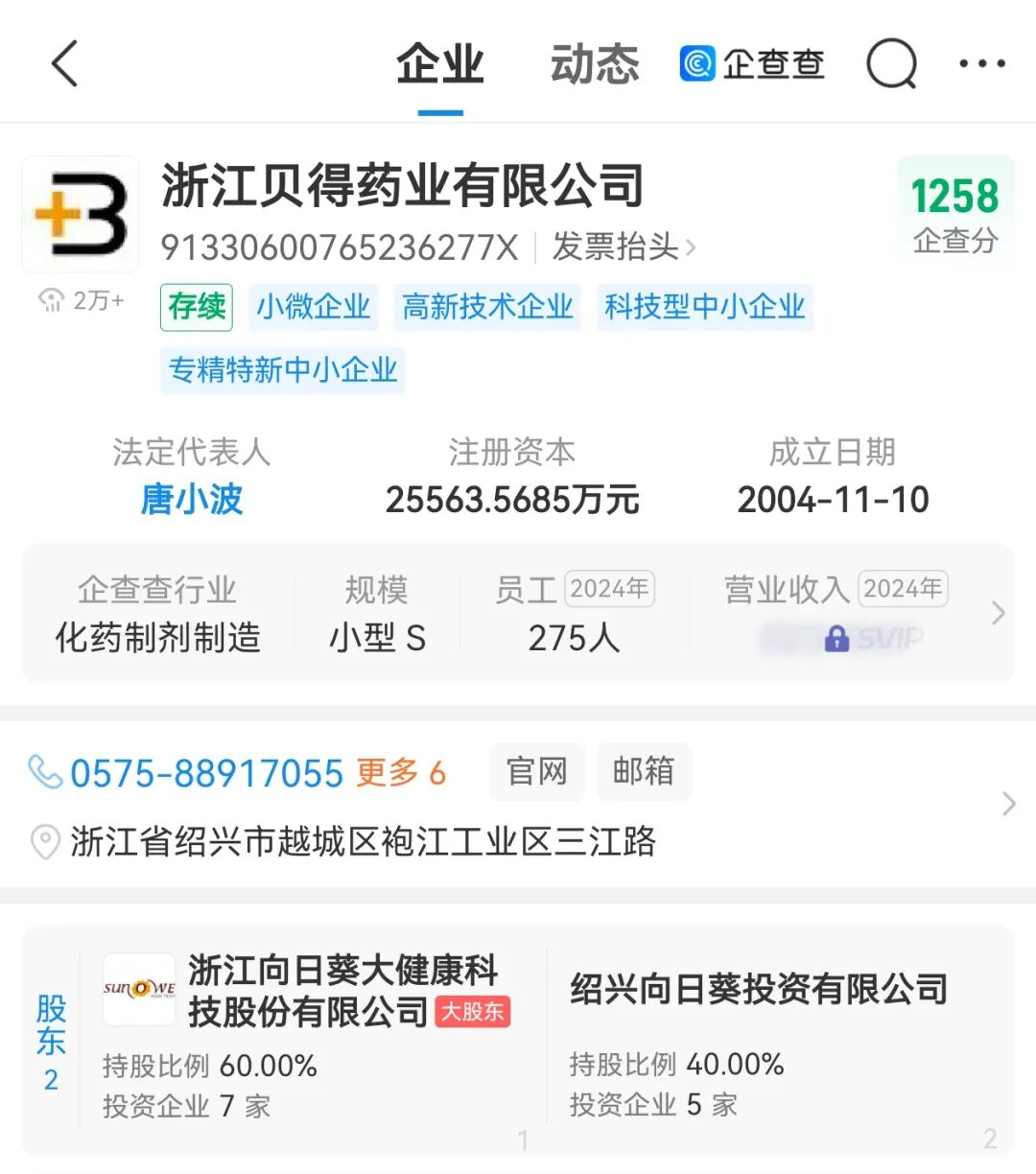 而贝得药业为向日葵的控股子公司,成立于2004年。目前向日葵持有贝得药业60%股份,拟收购的40%股份由绍兴向日葵投资有限公司持有。一旦收购完成,贝得药业将成为向日葵的全资子公司。