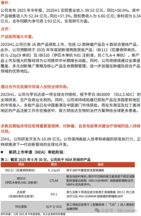 报告标题:《产品矩阵强大丰富,多款后期临床项目取得重要里程碑——信达生物(1801.HK)2025 年半年报点评》
