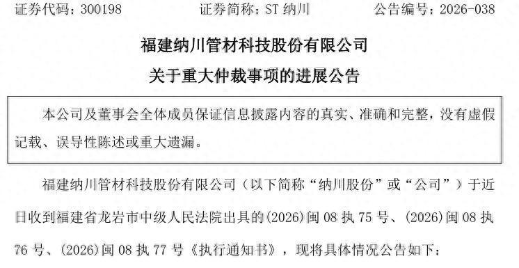 2月13日,ST纳川(300198)发布公告,近日收到福建省龙岩市中级人民法院出具的三份《执行通知书》,申请人是福建省政企合作引导投资基金合伙企业及兴业银行股份有限公司龙岩分行,被执行人是公司及公司子公司武平县纳川水环境发展有限公司,根据执行通知书,申请执行人要求被执行人立即偿还相关贷款本金及利息。