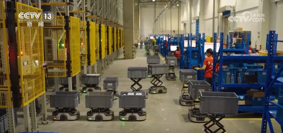 快速配合,在又高又密的货架间穿梭,确保货物精准入库,商品迅速上架。以前是“人找货”,分拣员每天要走五六万步;现在机器人可以实现“货找人”,飞梯机器人精准存取料箱,智狼小车高效转运,全流程自动化闭环,分拣效率比传统方式高出3倍以上。
